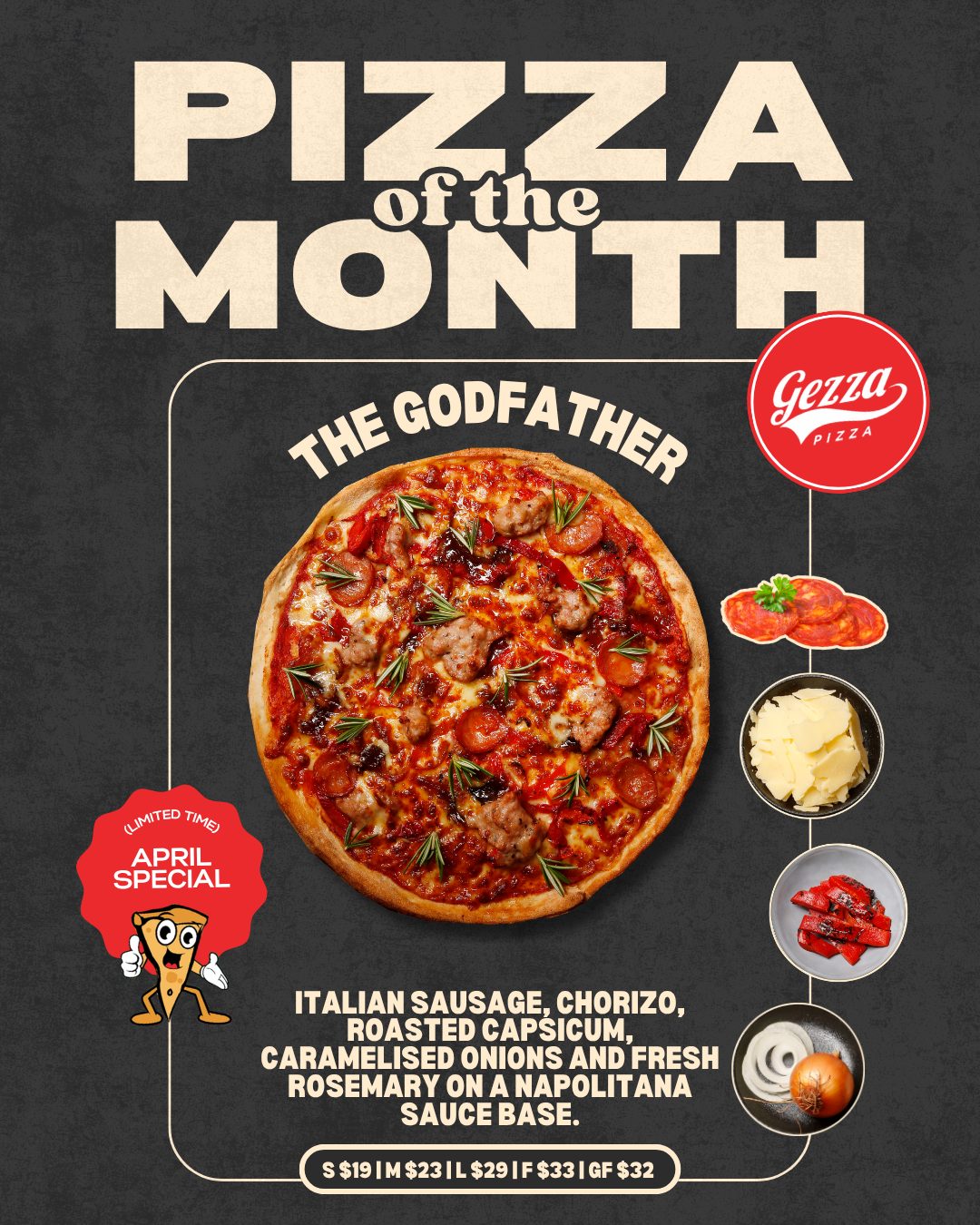 Napolitana base, Italian sausage, chorizo, roasted capsicum, caramelised onions, mozzarella, finished with parmesan.